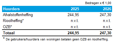 De verwachte lastendruk voor gebruikers/huurders van woningen is in 2026 ten opzichte van 2025 gestegen met € 2,35 (uitgangspunt in deze berekening is de aanslag afvalstoffenheffing op basis van een 240 liter container en een gemiddeld aantal ledigingen van 7 keer).