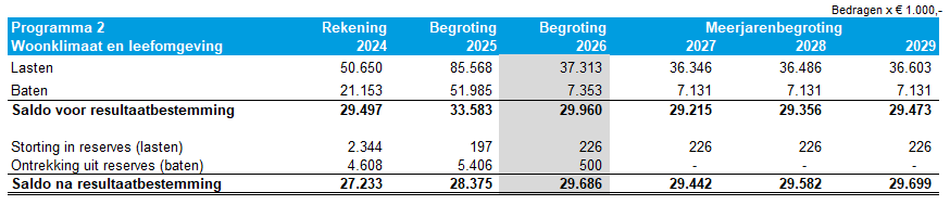 Begrotingstotalen van programma 2 Woonklimaat en leefomgeving
