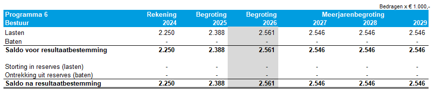Terug naar navigatie - 2.6 Programma 6 Bestuur - InleidingDit programma omvat alles wat te maken heeft met de raad en raadscommissies, burgemeester en wethouders, het gebouw Halte Democratie en de griffie. Ook de lasten voor referenda en verkiezingen en de kosten van bestuurlijke samenwerkingsverbanden worden hierin verantwoord.