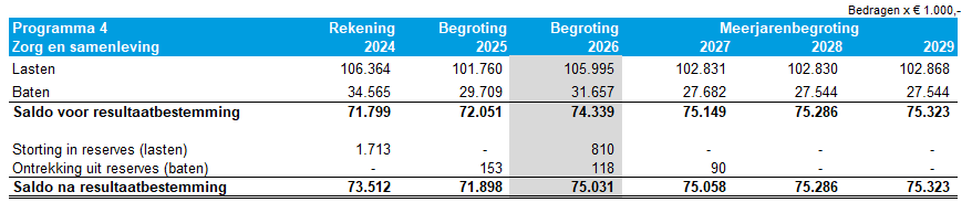 Terug naar navigatie - 2.4 Programma 4 Zorg en samenleving - Begrotingstotalen van programma 4 Zorg en samenleving2.5 Programma 5 Duurzaamheid en milieubeheer