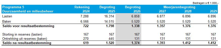Begrotingstotalen van programma 5 Duurzaamheid en milieubeheer