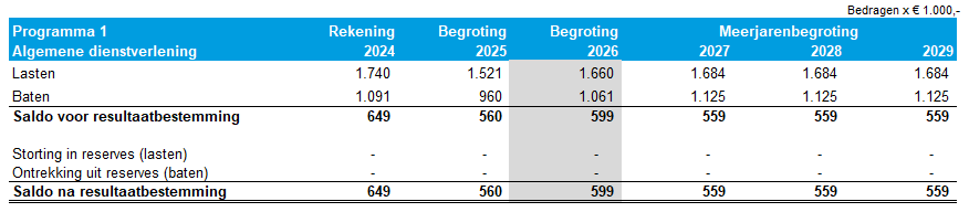 Terug naar navigatie - 2.1 Programma 1 Algemene dienstverlening - Begrotingstotalen van programma 1 Algemene dienstverlening2.2 Programma 2 Woonklimaat en leefomgeving
