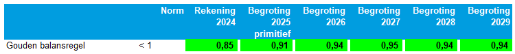 Onderstaand overzicht laat zien dat de gemeente Oldambt over de begrotingsjaren 2026 t/m 2029 voldoet aan de norm van de gouden balansregel: