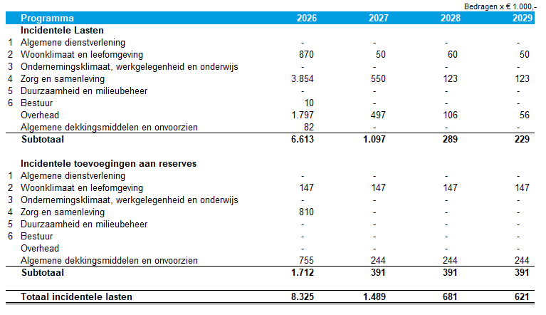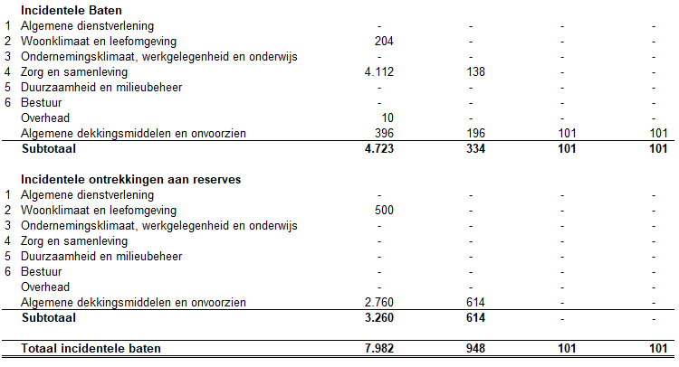 Terug naar navigatie - Bijlage 5: Overzicht incidentele en structurele baten en lasten - Overzicht incidentele baten en lastenIn onderstaand overzicht zijn de incidenteel geraamde baten en lasten gesaldeerd per programma.